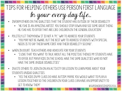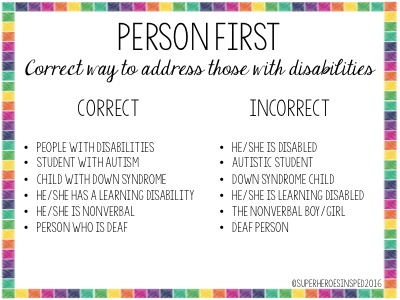 2022 UPDATE: While I personally choose to use person first language I understand individuals with disabilities have come out with the idea that they would like disability first. I 100% respect that and if someone with a disability tells me their preference I will absolutely make sure to identify them as they wish. It is all about understanding and respect for those that we interact with in and out of the classroom!